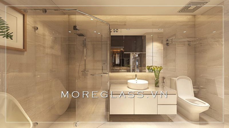 Mẫu thiết kế nhà tắm nhỏ này được trang bị phòng tắm kính đẹp, có cách sắp xếp nội thất, thiết bị vệ sinh hợp lí giúp tạo ra không gian thông thoáng cho căn phòng tắm nhỏ.