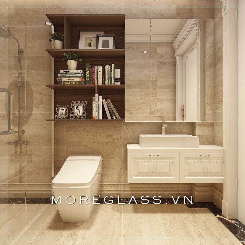 Mẫu thiết kế phòng vệ sinh hiện đại, có diện tích nhỏ gọn với các bố trí nội thất hợp lý, không gian được bố trí hài hòa và các ngăn nắp giúp tạo nên không gian thoáng mát hơn.