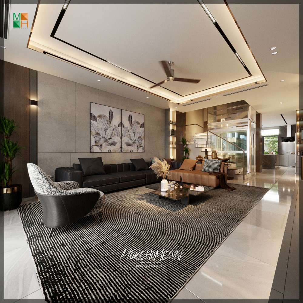 Mẫu thiết kế nội thất phòng khách chung cư cao cấp có tông màu chủ đạo là trắng, nâu và be, tạo nên một vẻ đẹp sang trọng, tinh tế, hút mọi ánh nhìn.